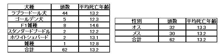 性別による比較では、オスの平均死亡年齢は13.3歳、メスは13.2歳で、オスの方がやや長寿でしたが、大きな差ではありません。