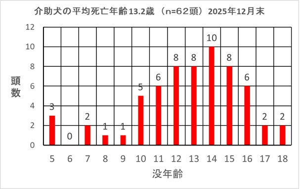 2025年12月31日までに死亡が確認された元・介助犬(補助犬法に基づき認定を受けた)のうち、生年月日と没年月日が判明している62頭について集計を行いました。