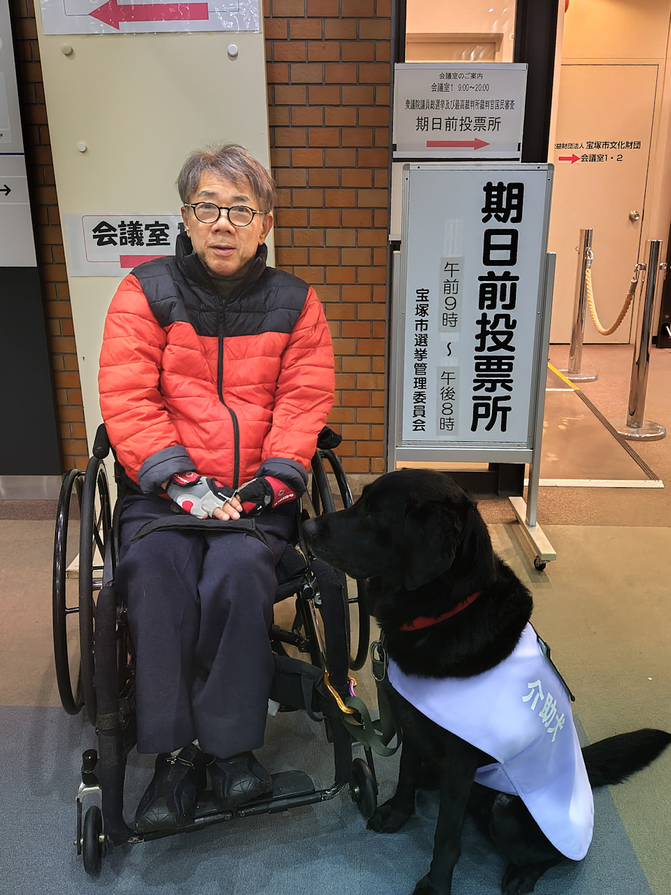 市役所は、広いホールが投票所になっているので、投票記載台のまわりにも余裕があり、エクラを車いすの横に伏せさせることができ、ゆったり投票できます。