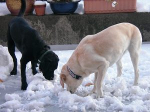 シンシアとエルモは雪が大好きで、降るとすぐに外へ出て、走り回ったり、顔を雪に突っ込んだりして楽しんでいたのですが、どういうわけか、デイジーとエクラは寒いのが苦手なようです。