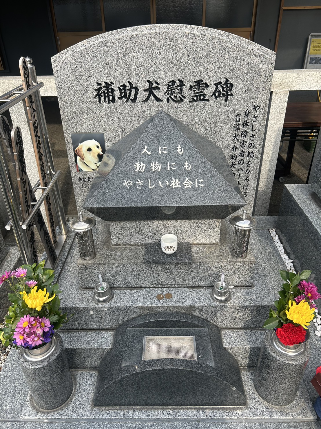 シンシアが亡くなった際、宝塚動物霊園さんからシンシアのお墓のお話しがあり、補助犬慰霊碑を建立していただくことになりました。そのため、慰霊碑にはシンシアの写真プレートが飾られています。