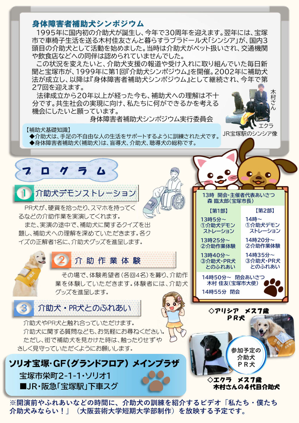 会場は昨年と同じく、買い物の途中などにも気軽に立ち寄っていただけるように、ソリオ宝塚のメインプラザ(イベント広場)です。介助犬クイズやデモンストレーション、介助動作体験、ふれあいコーナーなどがあります。お時間のある方は、ぜひいらしてください。私とエクラも参加します。